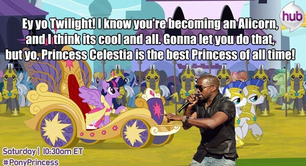 Kanye West needs to learn to let ponies finish their speeches! Although I'm not sure exactly what he's doing in Equestria, but I guess he didn't let her finishing about how.